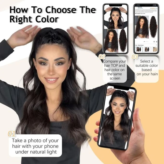 1. Natural-Looking Seamless Integration Crafted with seamless extensions that blend perfectly with natural hair, featuring high-elasticity claws for secure all-day hold without slipping. 2. Premium Synthetic Fiber Construction Made from ultra-soft synthetic fibers matching people hair texture. Measures 30 inches in wavy style with comfortable 160g weight. 3. Instant One-Step Application Simple clip-on design: just open the comb and secure over your existing bun or ponytail for immediate change. 4. Dual Wear Technology Functions as both clip-on ponytail for medium hair volumes and drawstring ponytail for thicker hair, ensuring universal compatibility. 5. Versatile Styling Potential Perfect for casual daywear to formal occasions, adaptable to multiple styling approaches that complement any fashion choice. 6. Complete Wearable Confidence Combines secure attachment with lightweight comfort, delivering natural movement and salon-quality results in seconds.