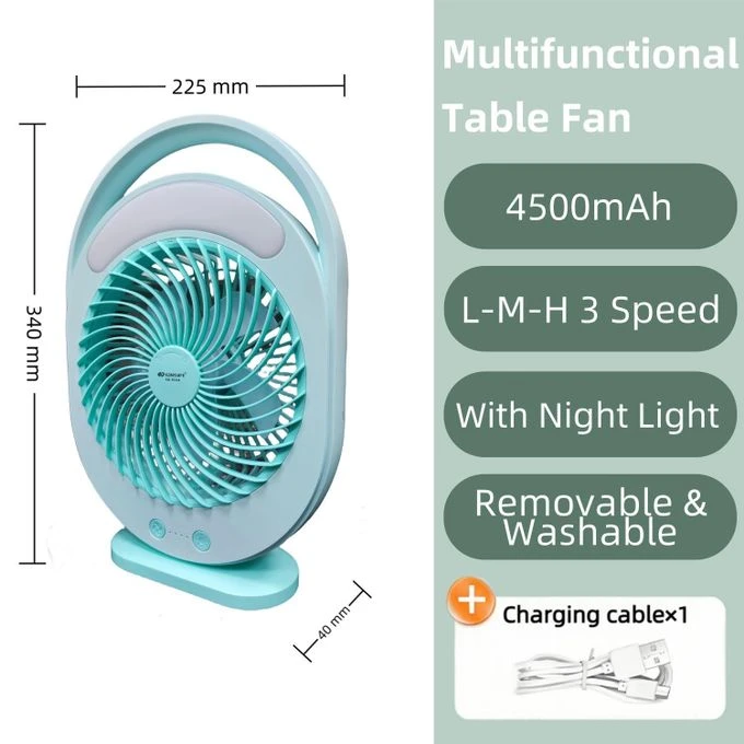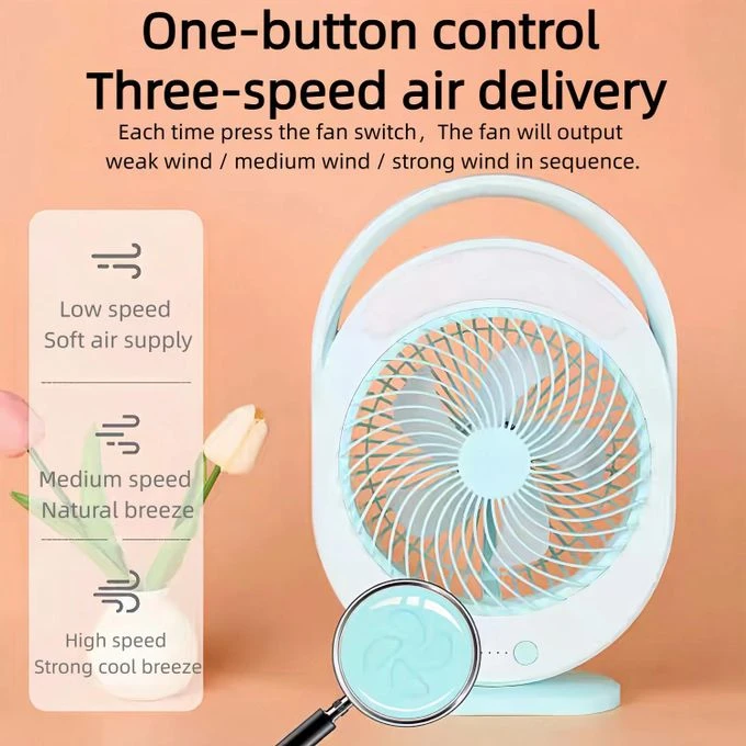 PRODUCT CHARACTERISTICS 1.This product is a mini fan with built-in safe, pollution-free , memory-free , non-polluting . 3.7V lithium-ion battery with rated capacity up to 4500mAh,long service life; 2.The wind speed is adjustable in three steps,the operation is simple and quick, and the appropriate air volume can be selected according to the needs. After the battery is fully charged,it can be operated for about 12 hours. 3.Product configuration micro-USB socket,as the product charging input port,you can directly use the mobile phone charger or adapter with USB output port to charge the product; 4.With overcharge and over discharge protection,trickle charge,charge status indication function; 5.The product adopts high quality motor,high efficiency, low energy consumption,low noise and long service life; 6.The product has a night light function, 18PCS SMD LED can be used for emergency lighting after power failure,lighting time is more than 20 hours,the touch switch to control the opening and closing of the night light;