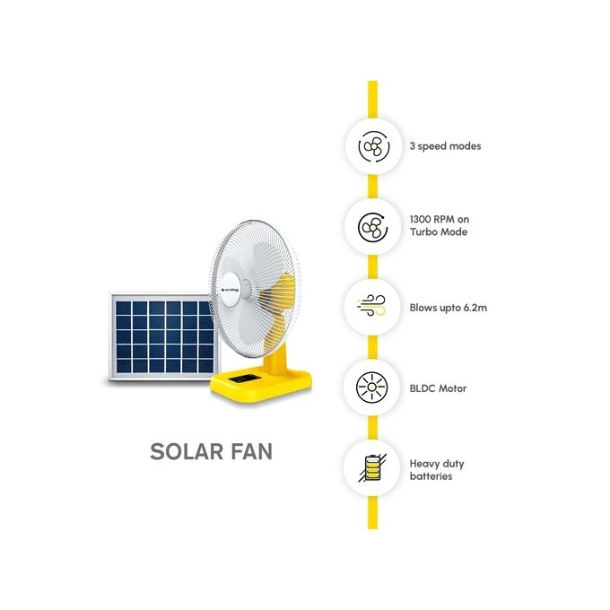 Greenlight Planet's latest product, the Sun King Fan strikes the perfect balance between performance, durability and affordability. It is designed to meet the basic cooling needs of under-electrified households around the world. The Sun King Fan has 16-inch blades which provide a powerful airflow with three Fan speed modes. It oscillates up to 90 degrees and features a built-in battery that charges directly from a 20W solar panel. The Sun King Fan has a powerful brushless motor, creating a uniquely quiet, user-friendly and flexible design.