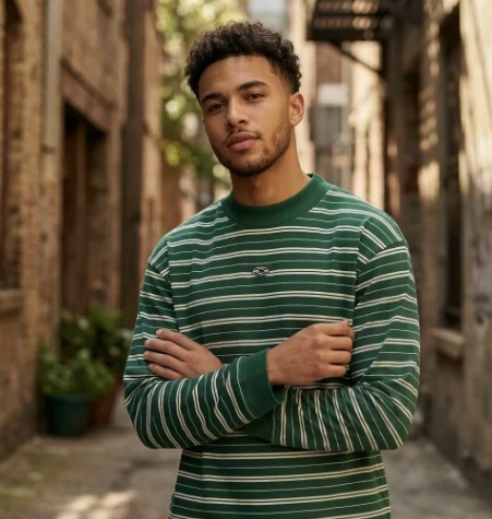 Elevate your daily rotation with a piece that balances retro sportiness and modern minimalism. The Evergreen Heritage Striped Mock-Neck is designed for those who appreciate clean lines and a structured silhouette. Featuring a rich pine-green base accented by crisp, horizontal cream stripes, this long-sleeve tee brings a sophisticated edge to casual dressing. Key Features • Premium Mid-Weight Cotton: Crafted for a soft hand-feel with enough structure to maintain its shape throughout the day. • Refined Mock-Neck: A slightly raised collar provides a modern look that sits higher than a traditional crew-neck, perfect for layering. • Micro-Embroidered Detail: A subtle, minimalist emblem is centered on the chest for a touch of understated branding. • Tailored Comfort: Designed with a contemporary fit that is relaxed through the body but clean at the shoulders. Styling Tip The deep forest tones pair exceptionally well with light-wash denim for a classic weekend look, or can be tucked into charcoal trousers for a more polished, "smart-casual" aesthetic. |