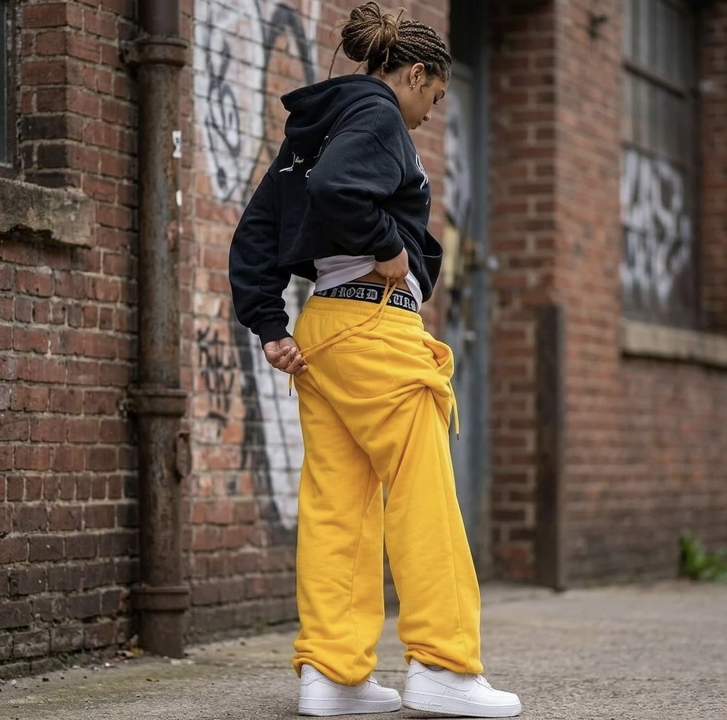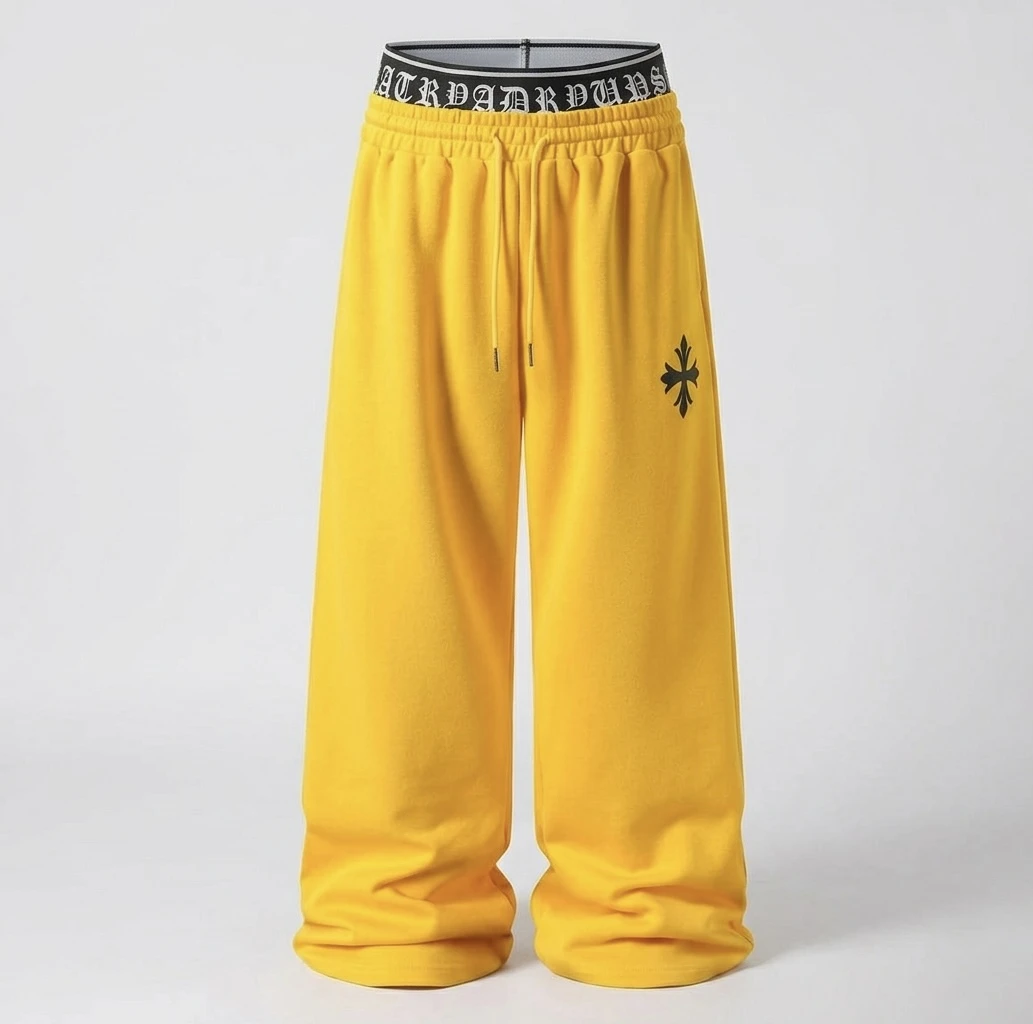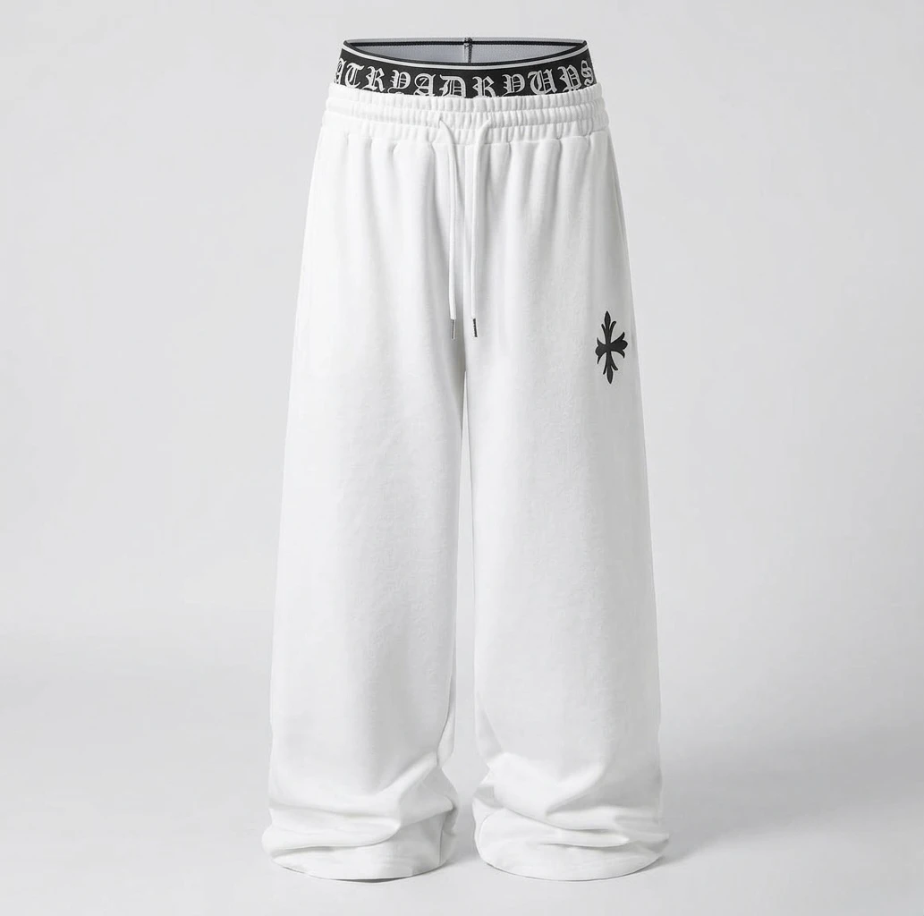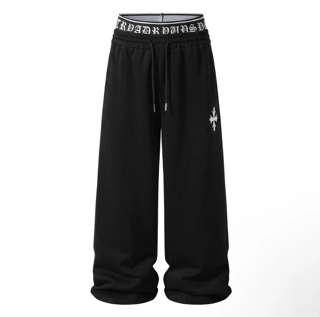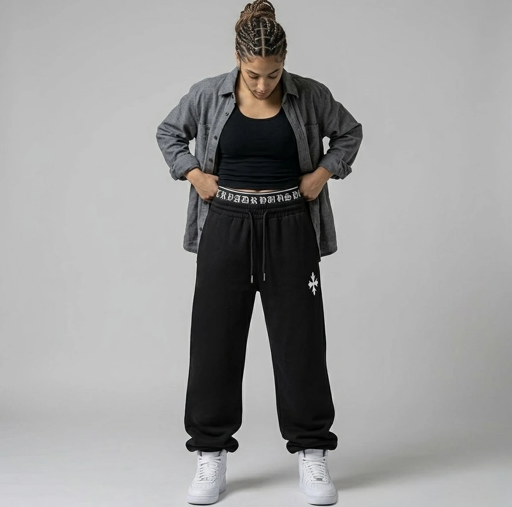 Step into the future of streetwear comfort with our Gothic Waist Wide-Leg Fleece Joggers. Designed for a bold, relaxed silhouette, these sweatpants redefine casual cool. Crafted from premium, heavy-weight cotton-fleece, the ultra-wide-leg cut provides an effortless drape that pools perfectly. The true standout feature is the dual-layer waistband construction: a traditional elastic waist with a functional external drawstring is topped by an exposed, contrasting black-and-white ribbed elastic band. This inner band proudly features repeating Old English 'ROAD RUNS' text, visible all around. Complete with a clean, crisp white star-cross logo on the side leg, these are more than just sweatpants they are a style statement. Key Features: • Ultra wide-leg, loose fit • Premium heavy-weight fleece fabric • Dual-layer waistband with exposed Gothic 'ROAD RUNS' text • External drawstring with metal tips • Iconic star-cross logo • Seamless white studio photography. |