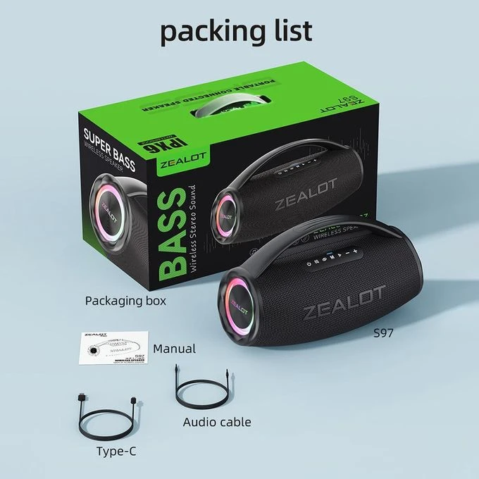 Specifications: Color: Black Material: ABS Battery: 16000mAh Loudspeaker: 76mm Output Power: 80W Standby Time: 30+ Days BT Type: 5.2 Item Size: 321 * 185 * 151mm/12.64 * 7.28 * 5.94in Item Weight: 2800g/98.77oz Package Size: 350 * 215 * 180mm/13.78 * 8.46 * 7.09in Package Weight: 3400g/119.93oz Key Features