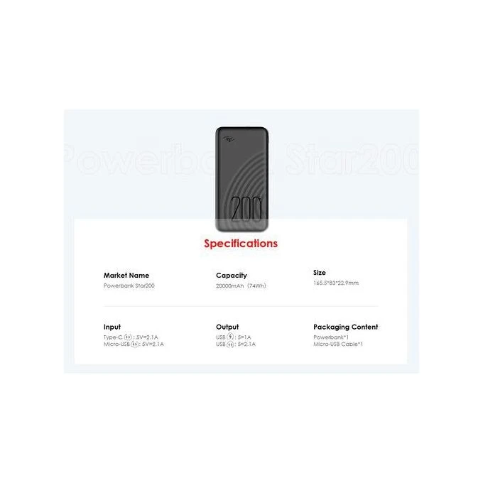 20000mAh High Capacity It holds enough energy to charge a phone and most tablets for days. Fast Charging for Two Itel exclusive charging technology ensures up to 2.1A charging speed for two device simultaneously. Recharge Your Way Choose between Micro USB or Type-C recharging way based on any cable you happen to have on hand. Anti-Slip Texture The 3D texture is resistant to stains and scratches to keeo the elegant look and prevents accidental slips Superior Safety Surge protection, short circuit prevention and more advanced safety features give you peace of mind. About this item 20000mAh battery power bank packs not only for portable charging but also around the home. Allowing you charge mobile devices without having to be tethered to a plug socket. Each of them fully charges 4.2 times for Samsung S10, 4 times for iPhone 11, 2.4 times for iPad mini 5 and 4.6 times for iPhone X. Dual Output & Input: Each has 2 USB output ports that detect all the connected devices and efficiently distributes the current output up to 5V 2.1A. The USB C and Micro USB ports can fully refill the battery itself in 10 hrs at 5V 2.0A. Reliable Li-polymer Cell: Thanks to the Li-polymer battery pack, the charger is much safer than any Li-ion charger. Also, it's lighter and slimer that you can easily carry it around, even on airplanes. Handy: It feels incredibly compact for a 20000mAh power bank, weighing just only 21mm thick. Grippy design is easy to hold, easy to toss into a bag and incredibly portable. What You Get: Itel 20000mAh USB Portable Charger ; 1 * USB Cable, 1 * 12 Month Warranty Key Features
