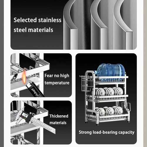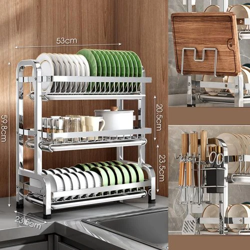 Three-layer stainless steel bowl and plate rack, with three drainage plates and thickened structure, anti-corrosion and anti-rust, strong load-bearing capacity! Keep the kitchen tidy, convenient for storage, structurally solid and stable without shaking. The accessories can be freely exchanged and their positions can be adjusted as needed Material: Stainless steel Number of floors: 3 floors Product size: 53*23.5*59.8 CM Welcome to the official MIIDIA store. All the products in our store have been strictly selected, with quality control and high cost performance. Please feel free to purchase! Key Features