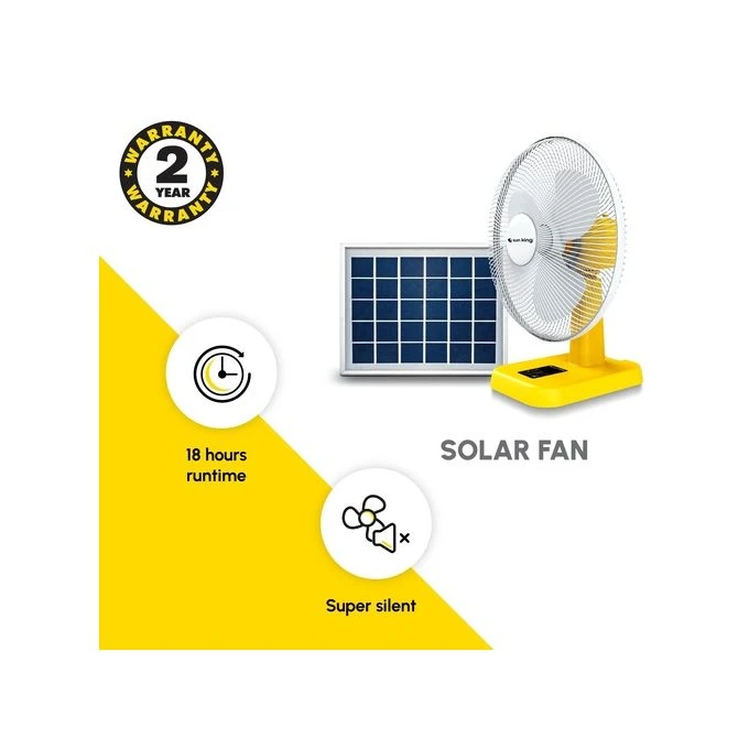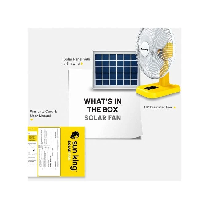 Greenlight Planet's latest product, the Sun King Fan strikes the perfect balance between performance, durability and affordability. It is designed to meet the basic cooling needs of under-electrified households around the world. The Sun King Fan has 16-inch blades which provide a powerful airflow with three Fan speed modes. It oscillates up to 90 degrees and features a built-in battery that charges directly from a 20W solar panel. The Sun King Fan has a powerful brushless motor, creating a uniquely quiet, user-friendly and flexible design.